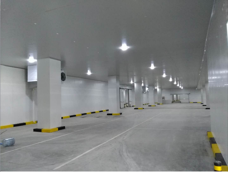 在冷庫(kù)庫(kù)板做好后,開(kāi)始做地面,首先把地基夯實(shí),并用自來(lái)水澆灌全部浸濕,干后再夯實(shí),鋪一層石頭,倒一層水泥找平。一般大型冷庫(kù)的地板都要做成鋼筋混泥土,防潮防水的保溫地面,地面強(qiáng)度要求叉車能自由進(jìn)入行駛裝貨卸貨。然后冷凍庫(kù)一般鋪入5公分的擠塑板三層,約十五公分的保溫層,保鮮庫(kù)一般鋪入5公分的擠塑板兩層,約十公分的保溫層,擠塑板要錯(cuò)位交叉,縫隙之間要填實(shí)填滿。
